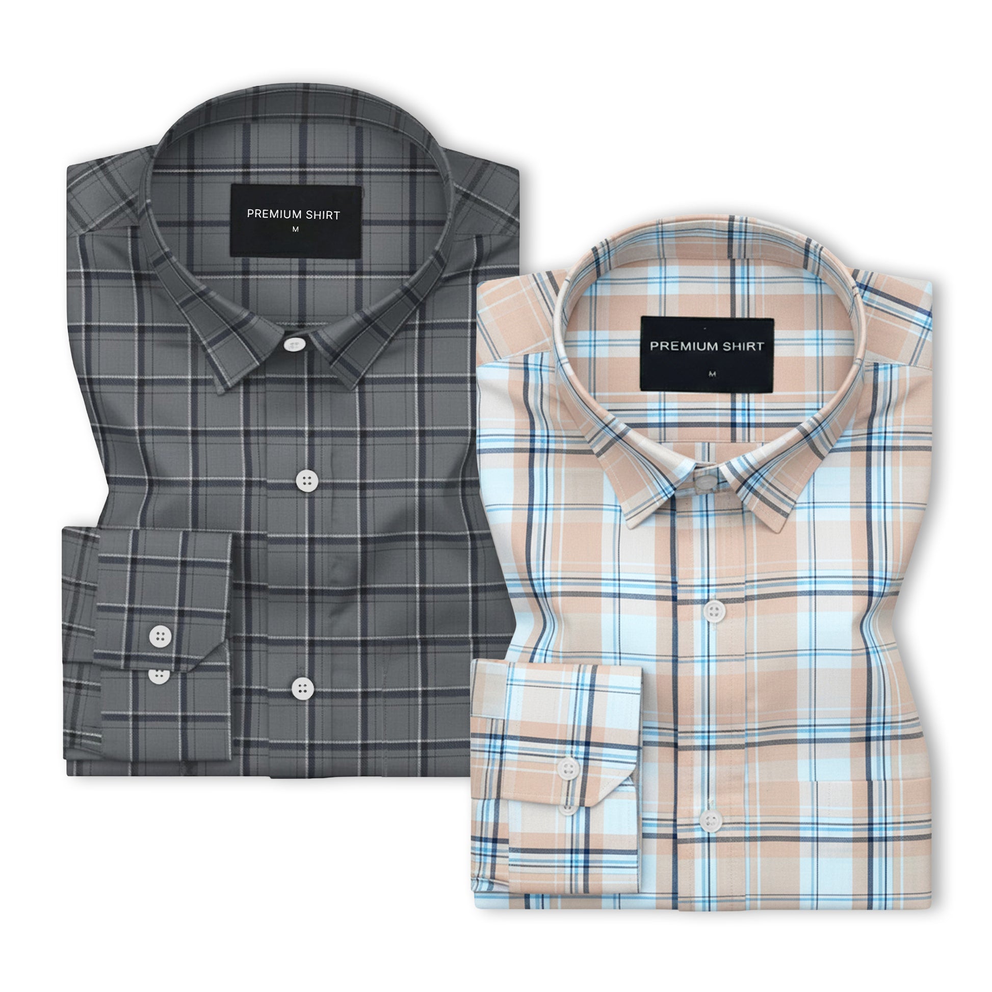 Pack of 2 Graphite & Peach White Classic Check Cotton Shirts Bundle For Men